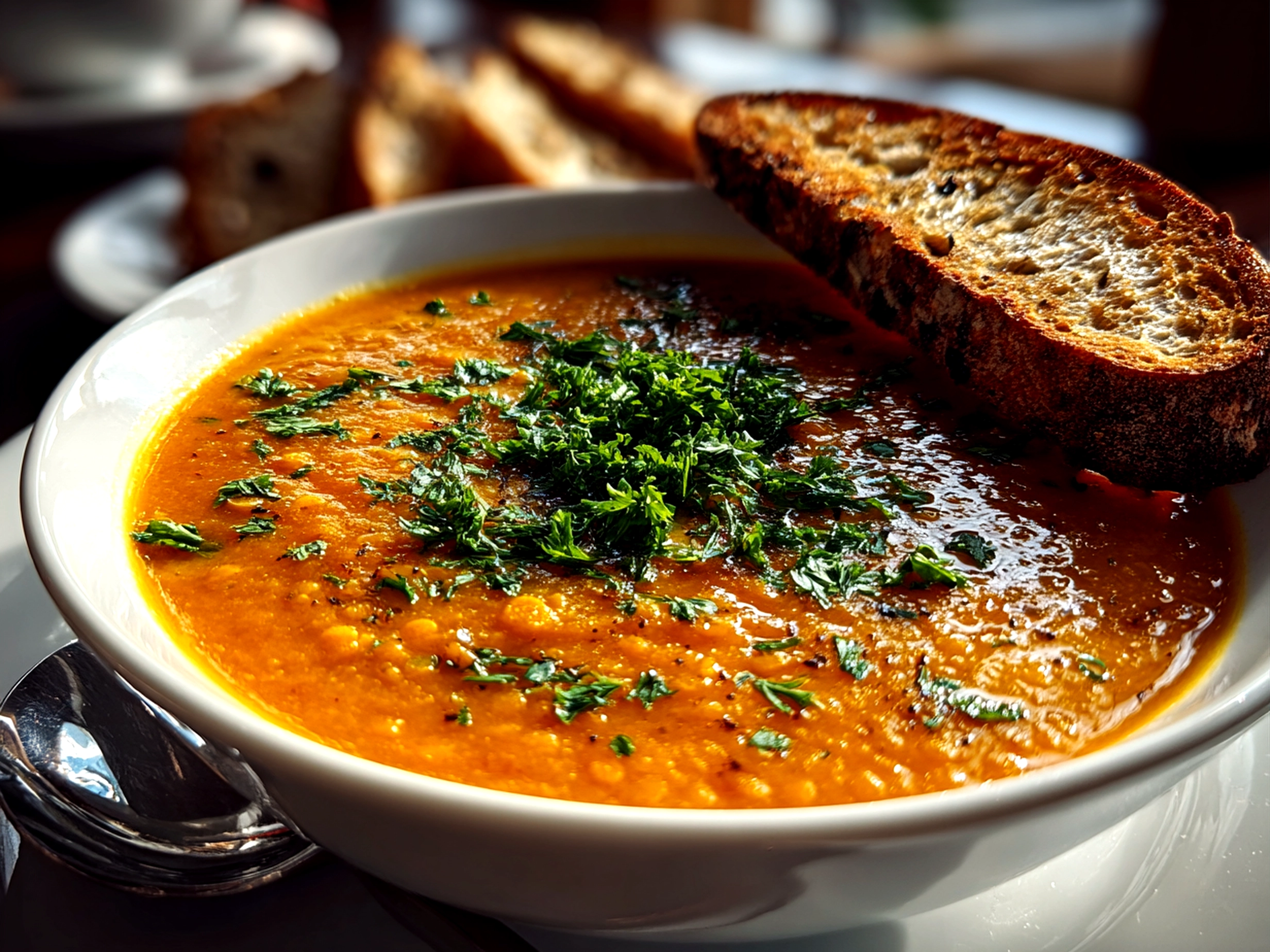 Bowl of Carrot and Lentil Soup served ready to eat