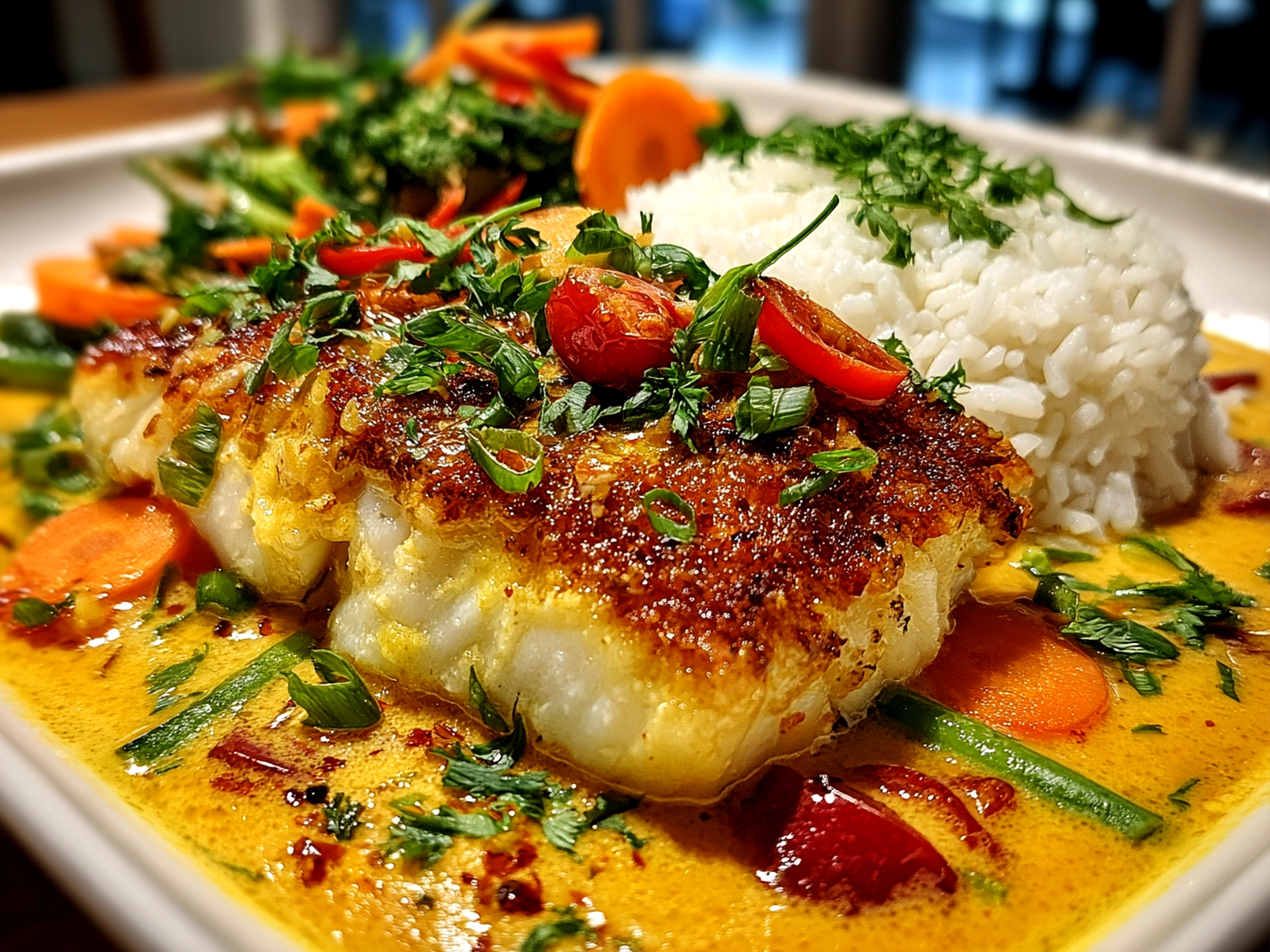 - Place cod fillets in a baking dish and pour the coconut curry sauce over them.