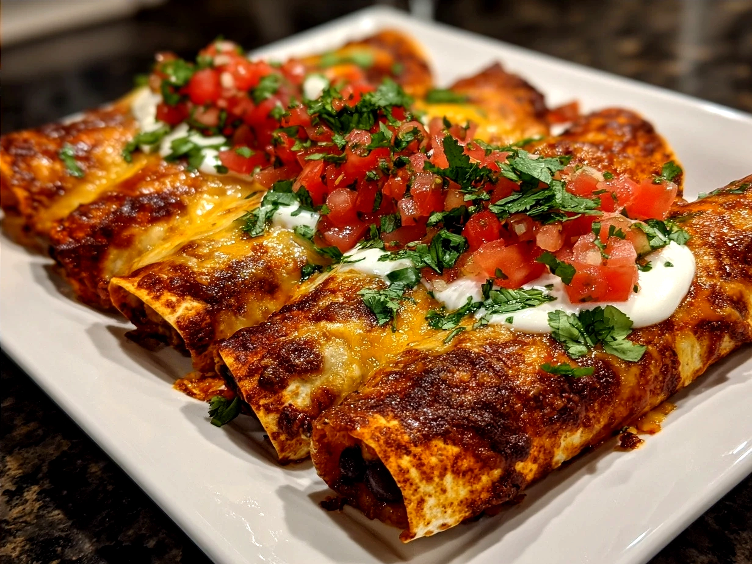 Use an 8×8-inch pan for a smaller batch or a 9×13-inch for a larger crowd. Just spread the enchiladas evenly and keep an eye on the bake time—it might change by 5-10 minutes depending on thickness.